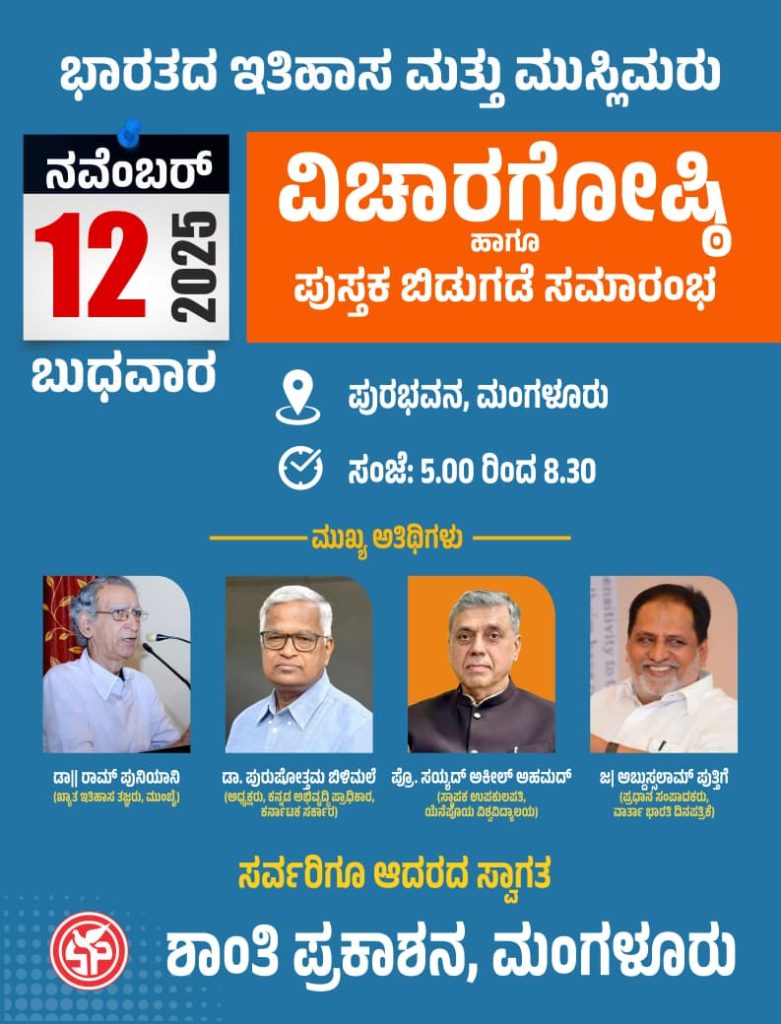 ದಿನಾಂಕ 12-11-2025 ಬುಧವಾರದಂದು ಮಂಗಳೂರಿನ ಪುರಭವನದಲ್ಲಿ ಸಂಜೆ 5 ಗಂಟೆಗೆ ‘ಶಾಂತಿ ಪ್ರಕಾಶನ’ ಹಮ್ಮಿ ಕೊಂಡಿರುವ ‘ಭಾರತದ ಇತಿಹಾಸ ಮತ್ತು ಮುಸ್ಲಿಮರು’ ವಿಚಾರಗೋಷ್ಠಿ ಮತ್ತು ಪುಸ್ತಕ ಬಿಡುಗಡೆ ಕಾರ್ಯಕ್ರಮದಲ್ಲಿ ಮುಂಬೈಯ ಖ್ಯಾತ ಇತಿಹಾಸ ತಜ್ಞ ಡಾ|| ರಾಮ್ ಪುನಿಯಾನಿಯವರು ಭಾಗವಹಿಸಲಿದ್ದಾರೆ.